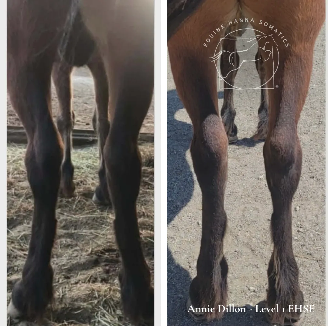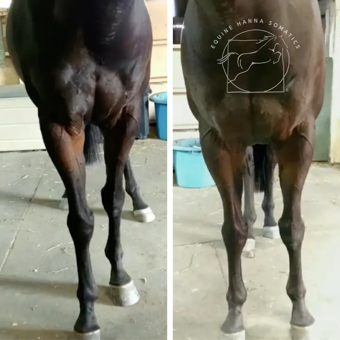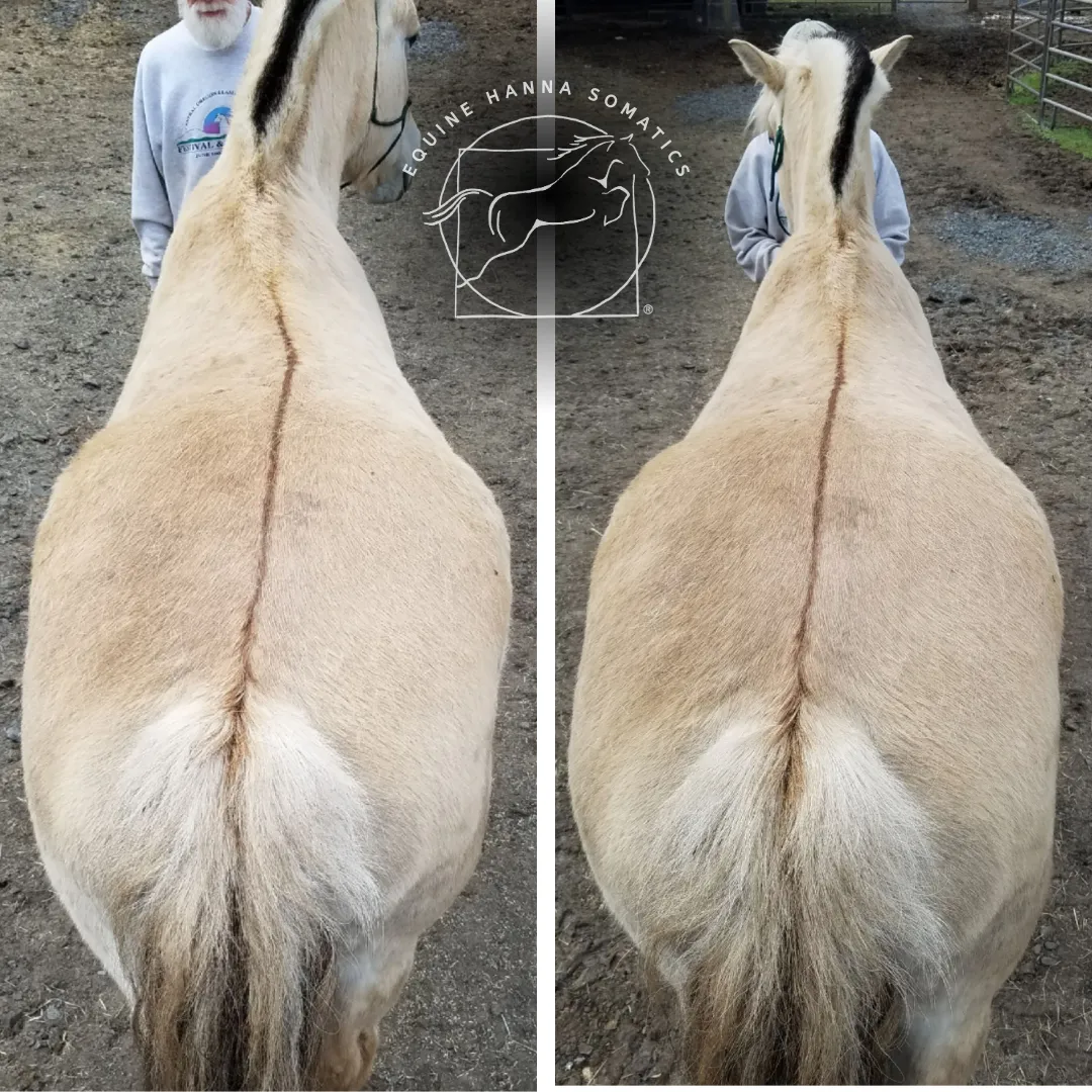 A roached back is part of a larger full-body postural pattern called the Red Light Reflex, which is one of the four universal postures we recognize and resolve with Equine Hanna Somatics Education.